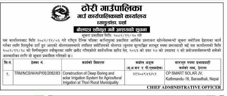 बोलपत्र स्वीकृत गर्ने आश्यको सूचना