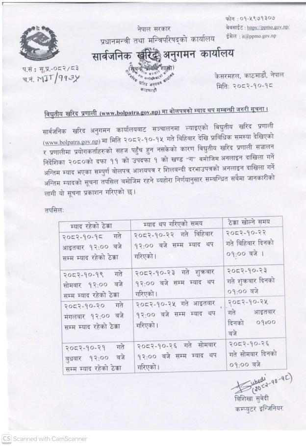 » विघुतीय खरिद प्रणालीमा बोलपत्रको म्याद थप सम्बन्धी जरुरी सूचना।