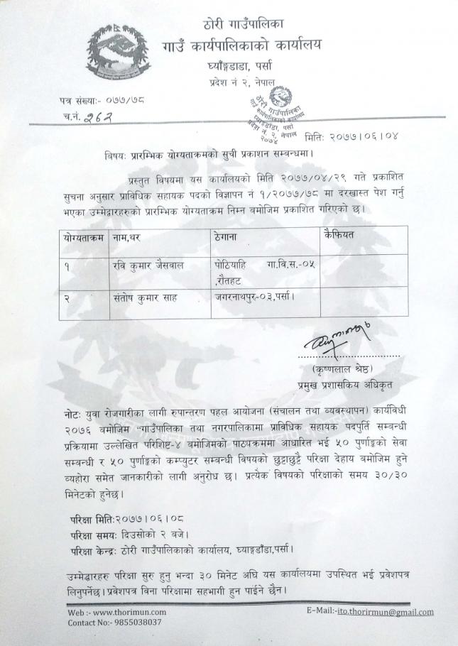 प्राविधिक सहायक पदको प्रारम्भिक योगयताक्रमको सुचि प्रकाशन गरिएको सम्बन्धमा