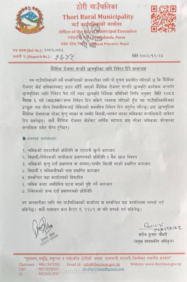 वैदेशिक रोजगार सन्तति छात्रवृत्तिको लागि निवेदन दिने सम्बन्धमा।