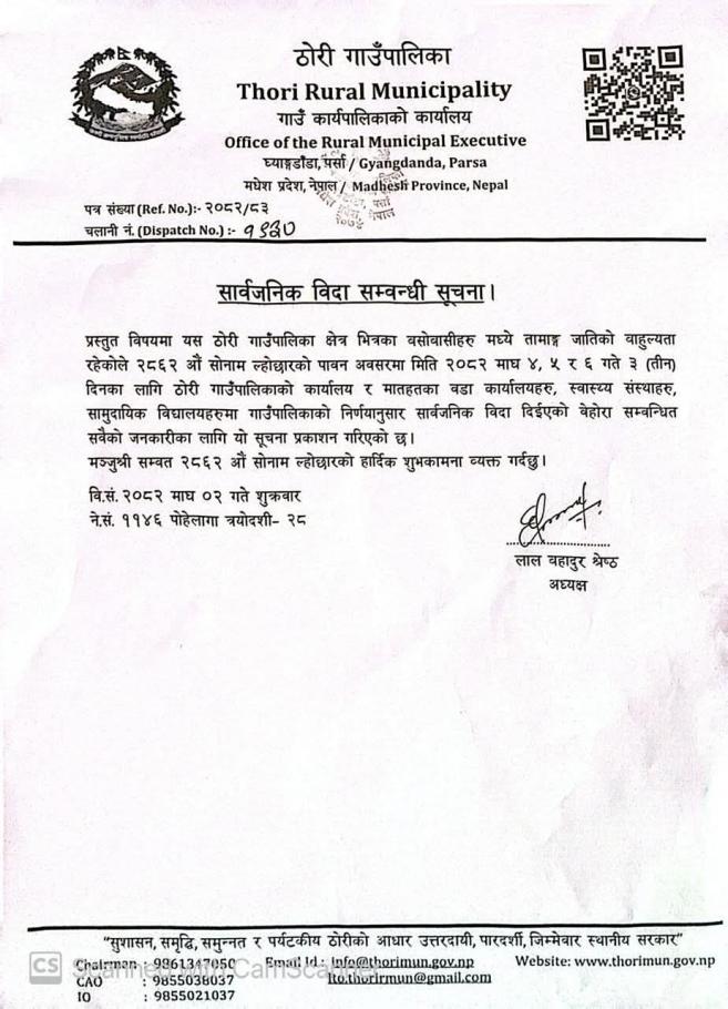 "सु-शासनयुक्त सक्षम एवं सवल स्थानिय सरकार ! पुर्वाधार निर्माण, कृषि, पर्यटन र सशक्तिकरण ठोरीको आधार !!"